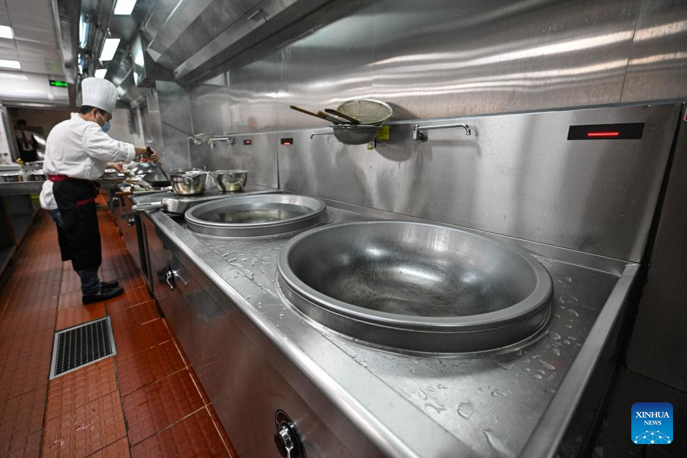 A chef cooks with an electric stove at a hotel kitchen in the Boao near-zero carbon demonstration zone in Boao, south China's Hainan Province, March 8, 2024. The Boao near-zero carbon demonstration zone was put into operation on Monday. Operation and management of the zone is carried out in a smart way to achieve near-zero carbon emission at the regional level. (Xinhua/Pu Xiaoxu)
