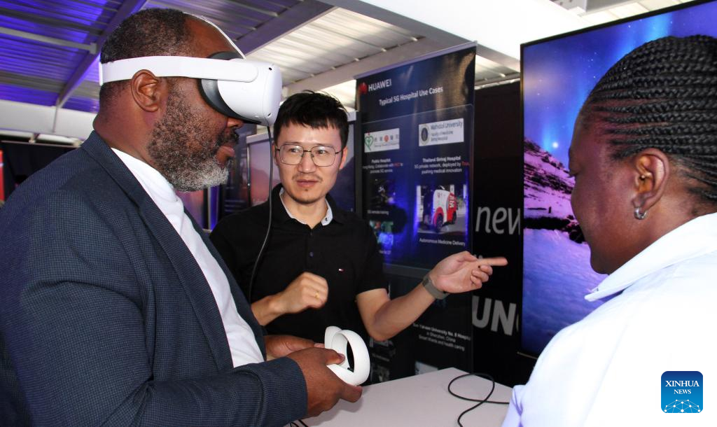 A man tries on a VR headset during a 5G technology demonstration in Windhoek, Namibia, on March 18, 2024. MTC, Namibia's largest mobile carrier, and Chinese company Huawei Technologies on Monday conducted the country's first 5G technology demonstration in Windhoek. (Photo by Musa C Kaseke/Xinhua)