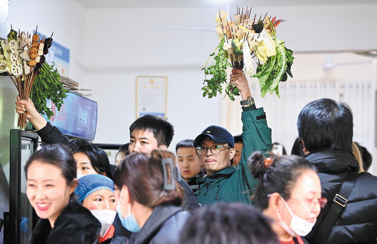 Customers hold on to their chosen ingredients at a crowded malatang restaurant in Tianshui, Gansu province, on Thursday. JIGME TENZIN / CHINA NEWS SERVICE