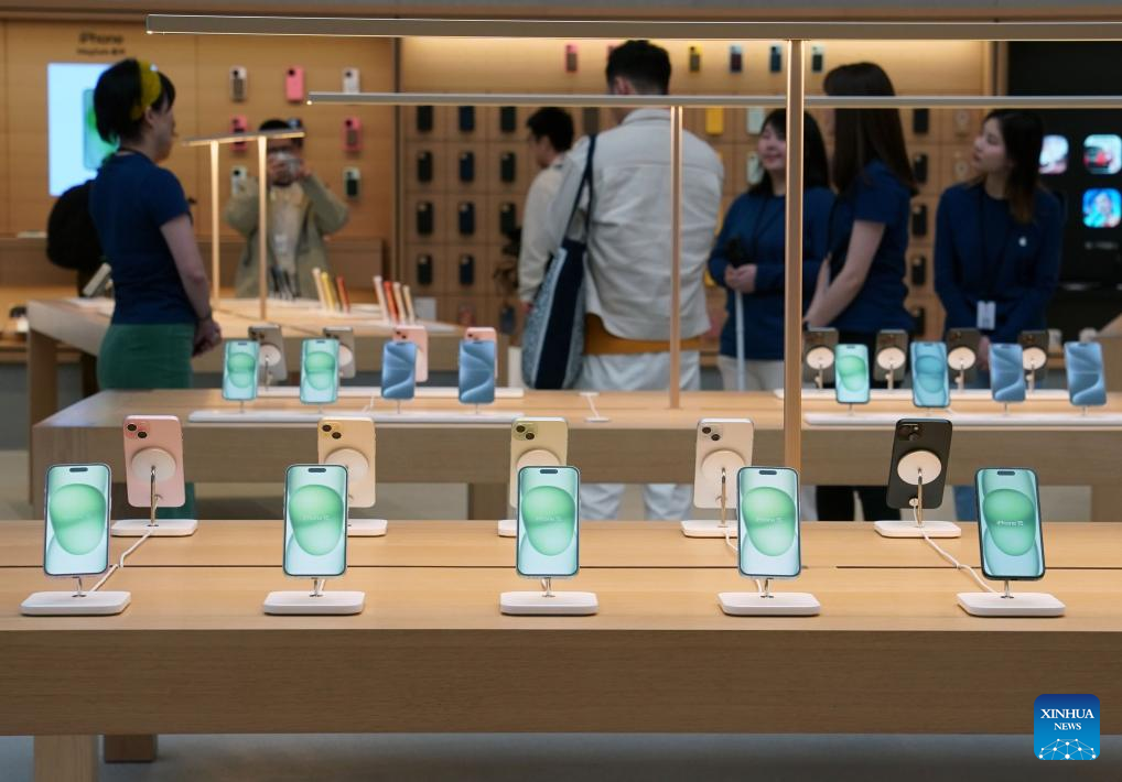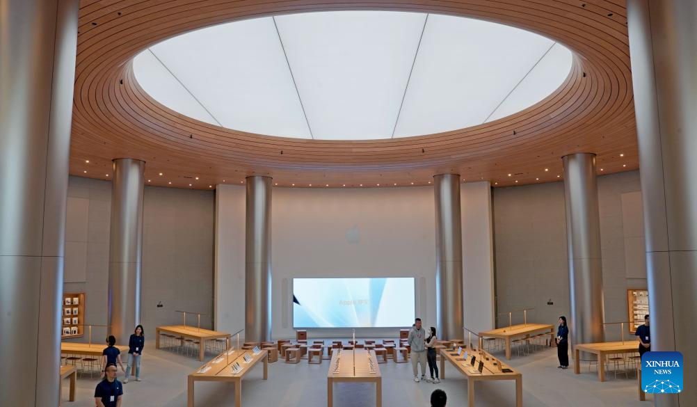 This photo taken on March 18, 2024 shows an interior view of a new Apple store, which is set to launch on March 21, in east China's Shanghai. Apple Inc. gears up to unveil its eighth store in Shanghai this month, augmenting its expansive network. (Xinhua/Liu Ying)