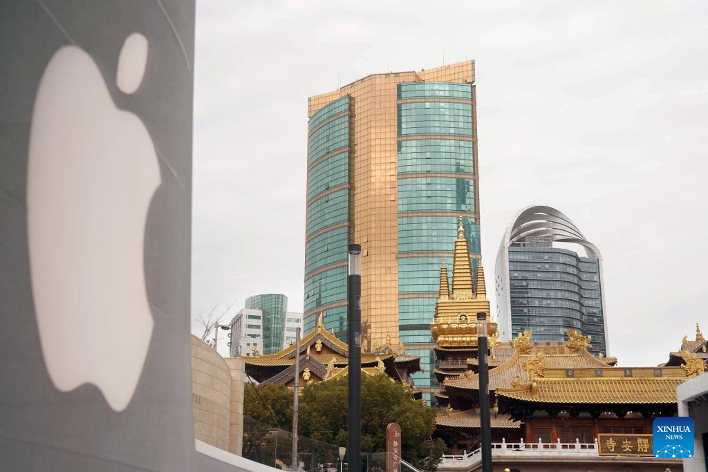 This photo taken on March 18, 2024 shows a logo of a new Apple store, which is set to launch on March 21, beside Jing'an Temple in east China's Shanghai. Apple Inc. gears up to unveil its eighth store in Shanghai this month, augmenting its expansive network. (Xinhua/Liu Ying)