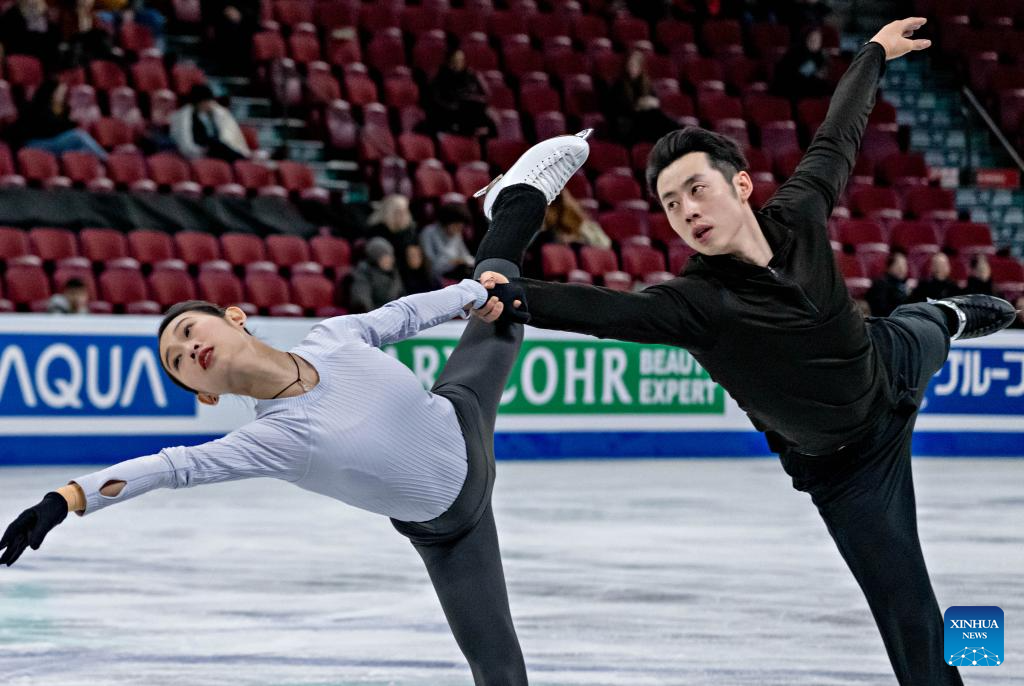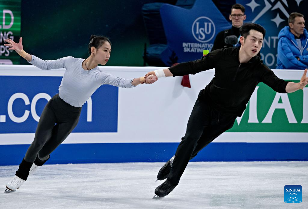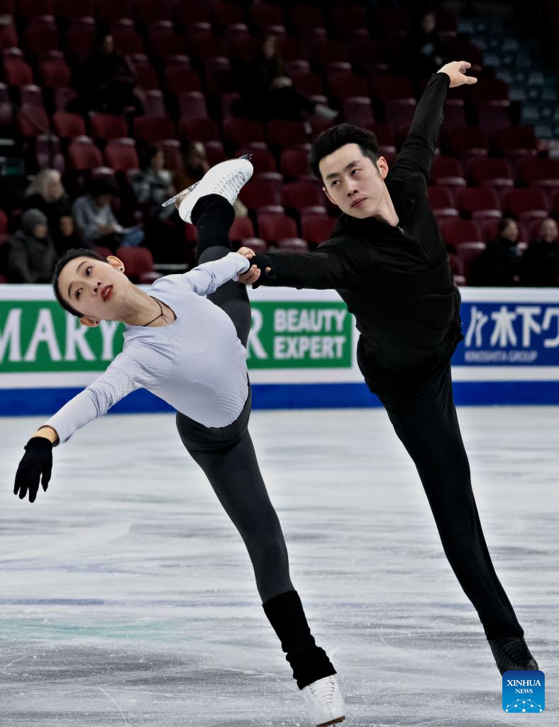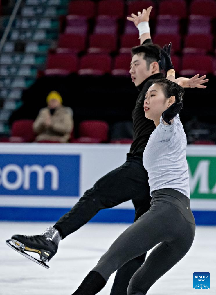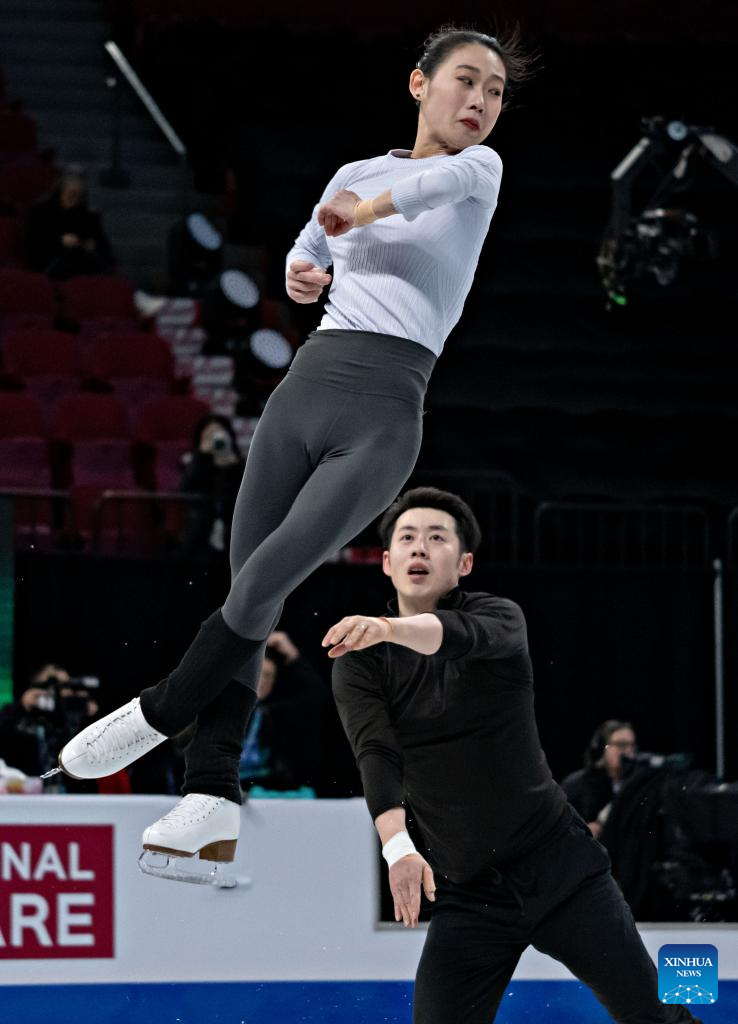 Peng Cheng (L)/Wang Lei of China practice pair skating during the practice session of the International Skating Union (ISU) World Figure Skating Championships in Montreal, Canada, March 18, 2024. (Photo by Andrew Soong/Xinhua)