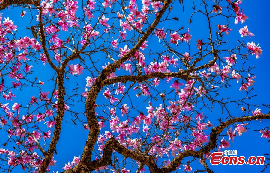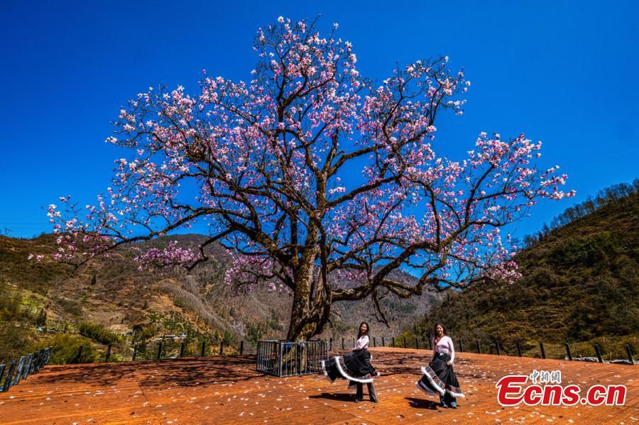 A magnolia tree with a history of more than 600 years blossoms with pink flowers in Shimian County of Ya'an City, southwest China's Sichuan Province. (Photo: China News Service/Zhou Wanlong)