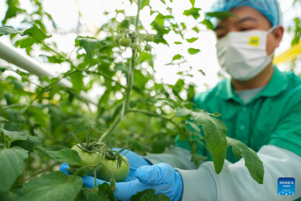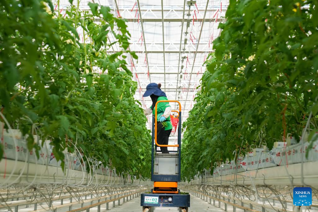 A worker shows tomatoes at a greenhouse of a smart agriculture industrial park in Jiamusi, northeast China's Heilongjiang Province, March 18, 2024. The city of Jiamusi is taking advantage of greenhouse to boost agricultural production efficiency. (Xinhua/Wang Jianwei)