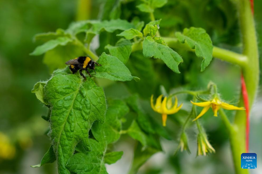 A bee is seen on the leaves of tomato plants at a greenhouse of a smart agriculture industrial park in Jiamusi, northeast China's Heilongjiang Province, March 18, 2024. The city of Jiamusi is taking advantage of greenhouse to boost agricultural production efficiency. (Xinhua/Wang Jianwei)