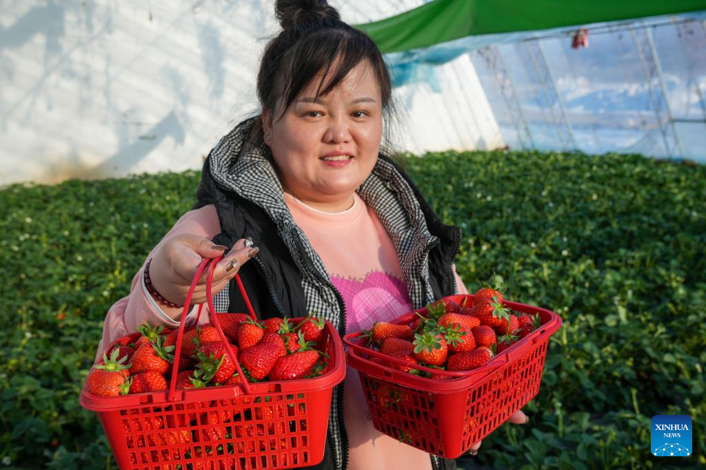A woman shows newly-picked strawberries at a greenhouse of a modern agriculture industrial park on the outskirts of Jiamusi, northeast China's Heilongjiang Province, March 18, 2024. The city of Jiamusi is taking advantage of greenhouse to boost agricultural production efficiency. (Xinhua/Wang Jianwei)