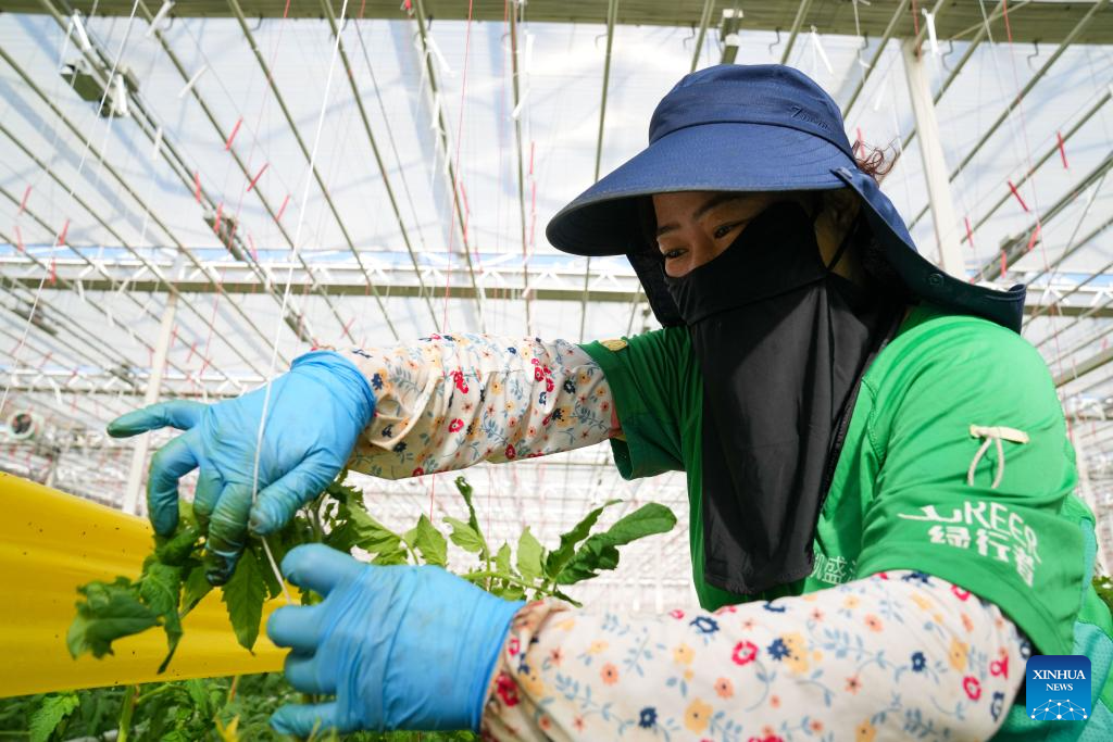 A woman processes tomato seedlings at a greenhouse of a smart agriculture industrial park in Jiamusi, northeast China's Heilongjiang Province, March 18, 2024. The city of Jiamusi is taking advantage of greenhouse to boost agricultural production efficiency. (Xinhua/Wang Jianwei)