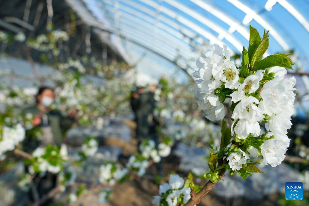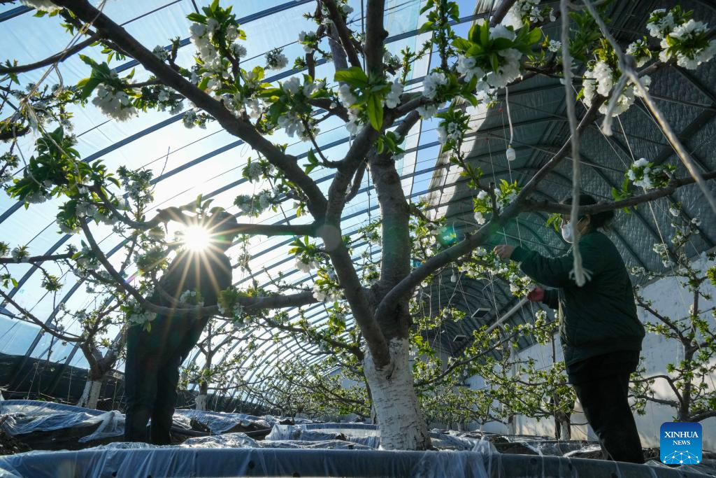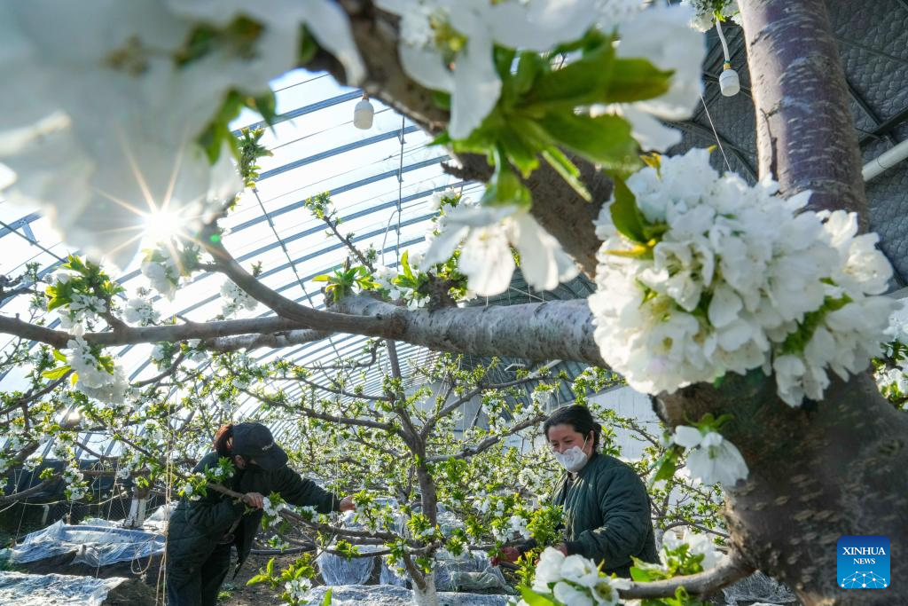 Workers thin the flowers of cherry trees at a greenhouse of a modern agriculture industrial park on the outskirts of Jiamusi, northeast China's Heilongjiang Province, March 18, 2024. The city of Jiamusi is taking advantage of greenhouse to boost agricultural production efficiency. (Xinhua/Wang Jianwei)