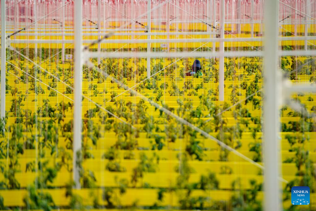 A worker is seen at a greenhouse of a smart agriculture industrial park in Jiamusi, northeast China's Heilongjiang Province, March 18, 2024. The city of Jiamusi is taking advantage of greenhouse to boost agricultural production efficiency. (Xinhua/Wang Jianwei)