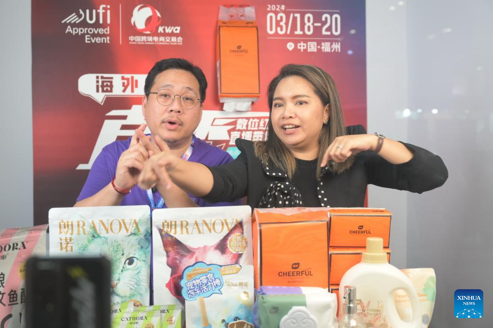 A Malaysian livestreamer sells products via a livestream session during the 4th China Cross-border E-commerce Trade Fair in Fuzhou, southeast China's Fujian Province, March 18, 2024. (Xinhua/Lin Shanchuan)