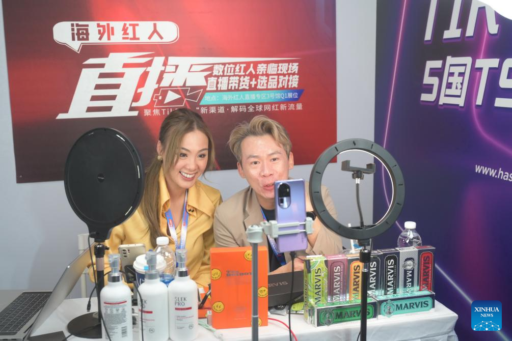 Thai livestreamers sell products via a livestream session during the 4th China Cross-border E-commerce Trade Fair in Fuzhou, southeast China's Fujian Province, March 19, 2024.?(Xinhua/Lin Shanchuan)