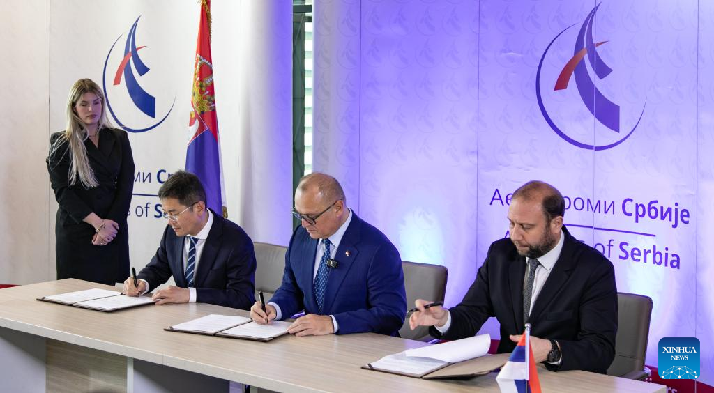 Director of China Shandong International Economic & Technical Cooperation Group Zhuang Yong (2nd L), Serbian Minister of Construction, Transport and Infrastructure Goran Vesic (2nd R), and Acting Director of "Aerodromi Srbije" (Airports of Serbia) Mihajlo Zdravkovic (1st R) sign the contract for expansion of Serbia's Konstantin Veliki Airport in Nis, southeastern Serbia, on March 19, 2024. Serbia's Konstantin Veliki Airport in the southeast city of Nis is set for expansion after an infrastructure development contract was awarded to China's Shandong Hi-Speed Group on Tuesday. (Photo by Wang Wei/Xinhua)