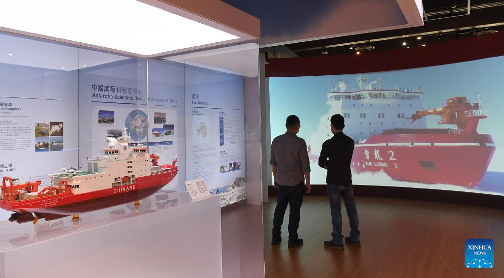 People visit the Polar Research and Climate Change exhibition at Hong Kong Science Museum in Hong Kong, south China, March 19, 2024. Available to the public from March 18 till June 26, the exhibition will expose audiences to the scientific expeditions and research accomplishments of China's polar icebreaker Xuelong 2. (Xinhua/Chen Duo)