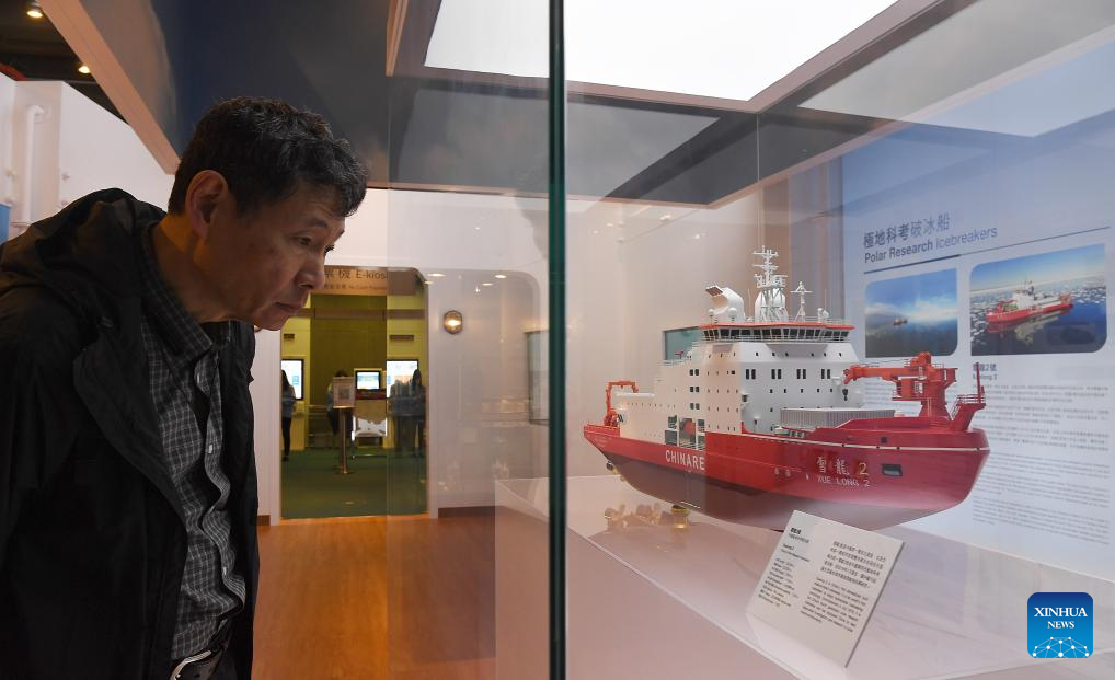 A visitor views a model of China's polar icebreaker Xuelong 2 at the Polar Research and Climate Change exhibition at Hong Kong Science Museum in Hong Kong, south China, March 19, 2024. Available to the public from March 18 till June 26, the exhibition will expose audiences to the scientific expeditions and research accomplishments of China's polar icebreaker Xuelong 2. (Xinhua/Chen Duo)