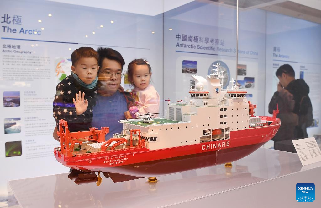 Visitors view a model of China's polar icebreaker Xuelong 2 at the Polar Research and Climate Change exhibition at Hong Kong Science Museum in Hong Kong, south China, March 19, 2024. Available to the public from March 18 till June 26, the exhibition will expose audiences to the scientific expeditions and research accomplishments of China's polar icebreaker Xuelong 2. (Xinhua/Chen Duo)