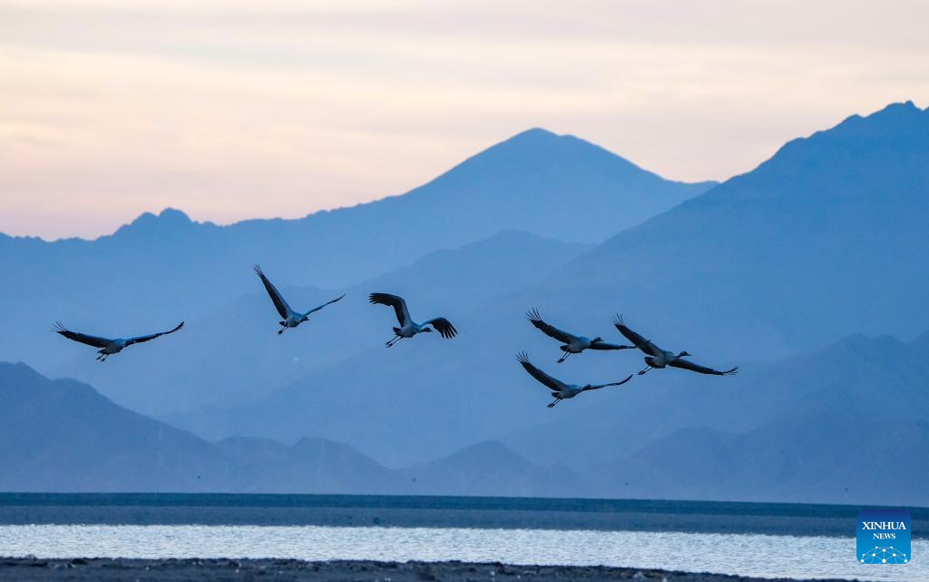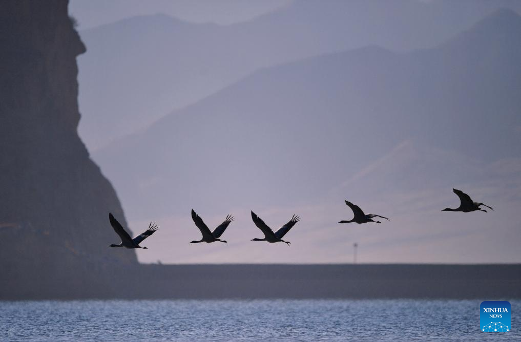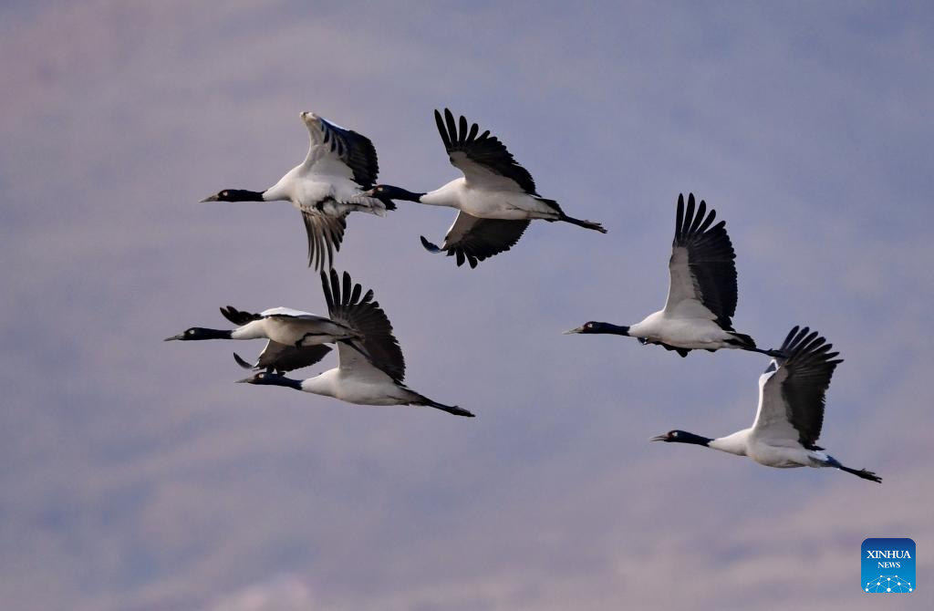 Black-necked cranes fly at a reservoir in Lhunzhub County of Lhasa, southwest China's Xizang Autonomous Region, March 17, 2024. As the temperature gradually rises, black-necked cranes have started their migration from the reservoir in Lhunzhub County. The black-necked crane, a species under first-class state protection in China, mainly inhabits plateau meadows and marshes at an altitude of 2,500 to 5,000 meters. (Xinhua/Zhang Rufeng)