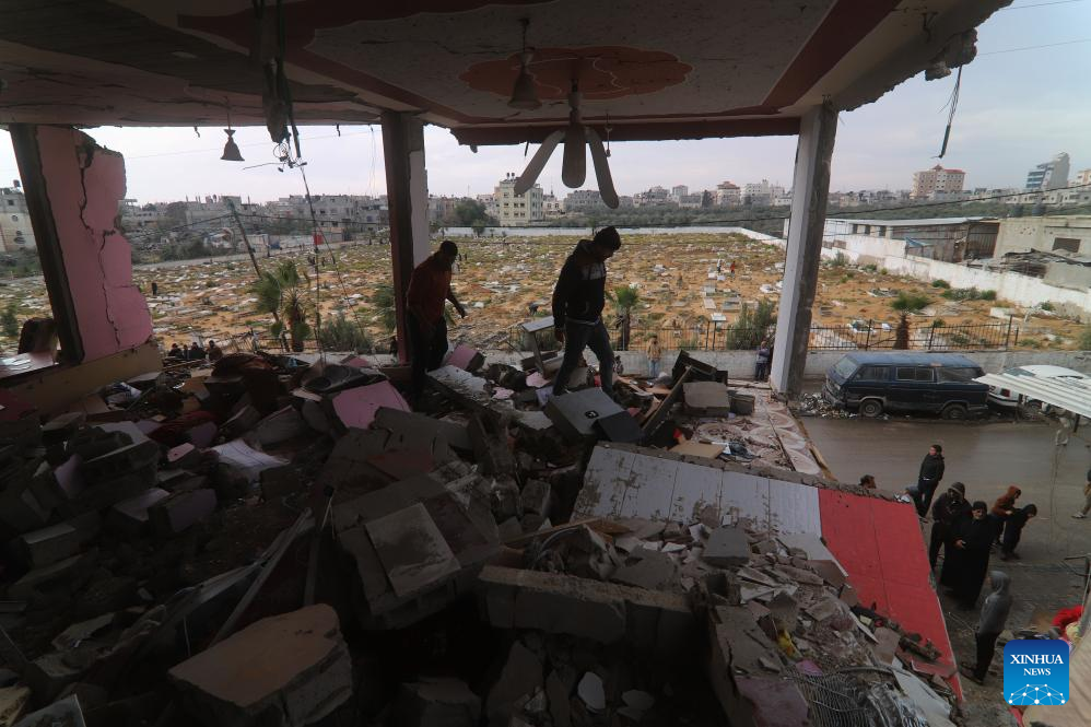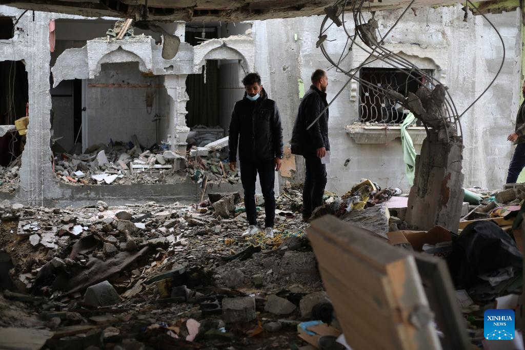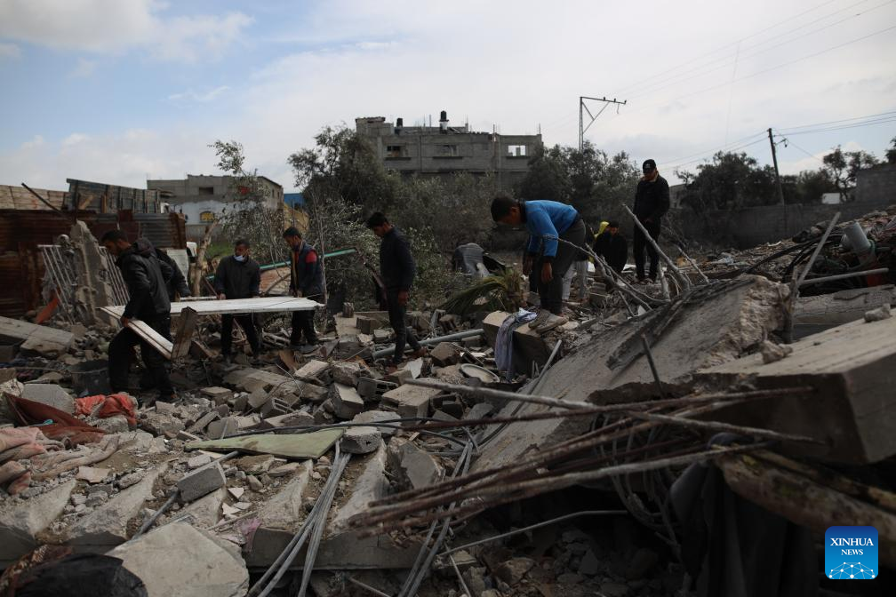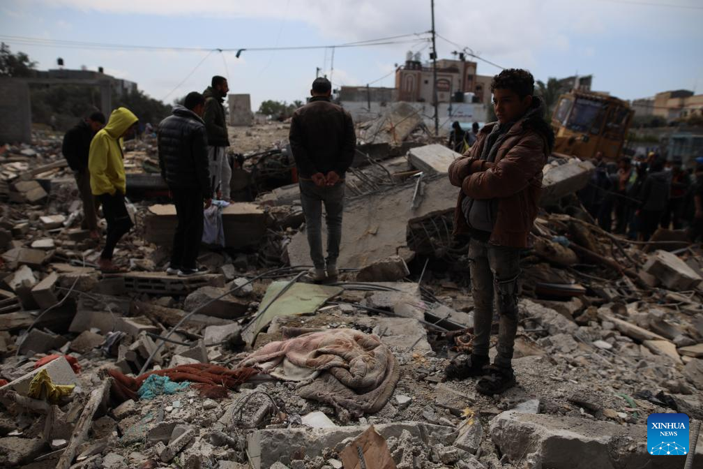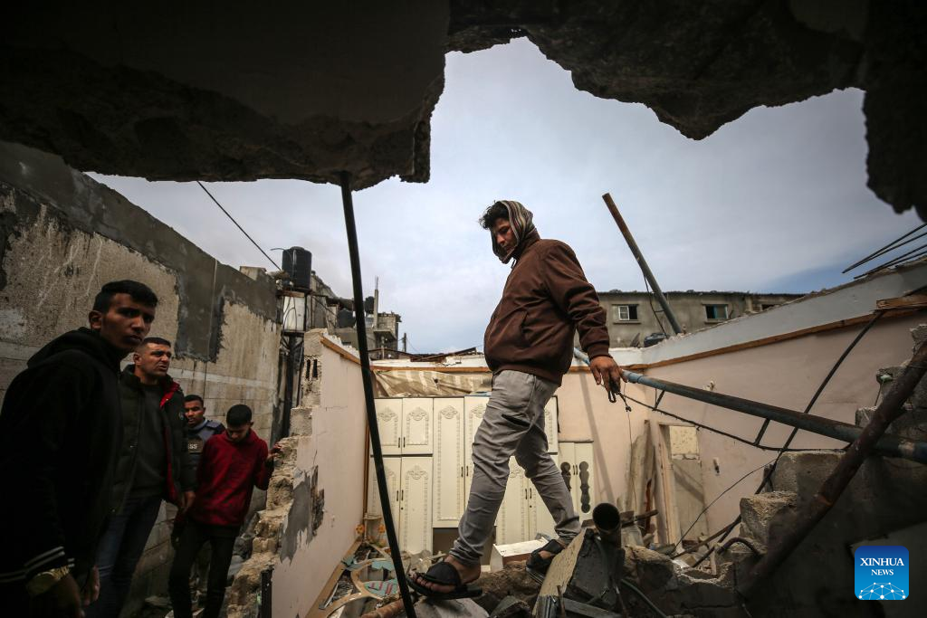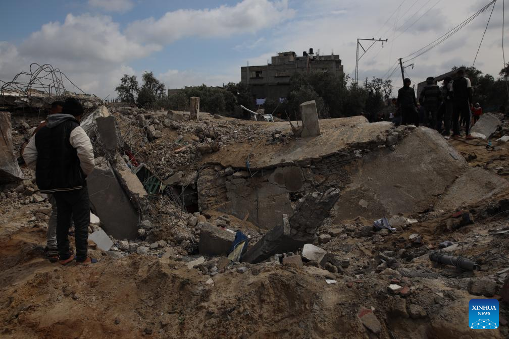 People inspect a destroyed building after an Israeli airstrike in the southern Gaza Strip city of Rafah, March 19, 2024.?(Photo by Khaled Omar/Xinhua)