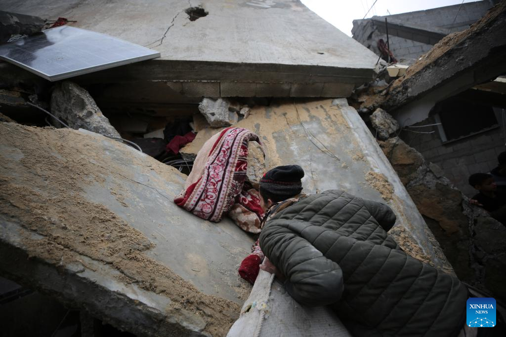 A man searches among the rubble of a destroyed building in the southern Gaza Strip city of Rafah, on March 19, 2024. (Photo by Yasser Qudih/Xinhua)
