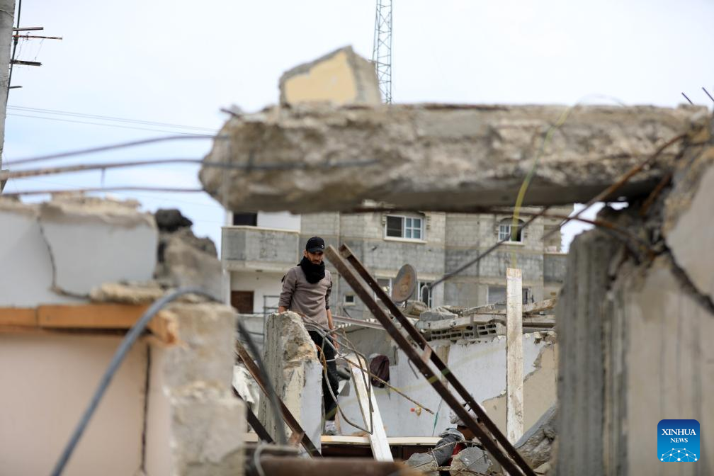 A man inspects a destroyed building in the southern Gaza Strip city of Rafah, on March 19, 2024. (Photo by Yasser Qudih/Xinhua)