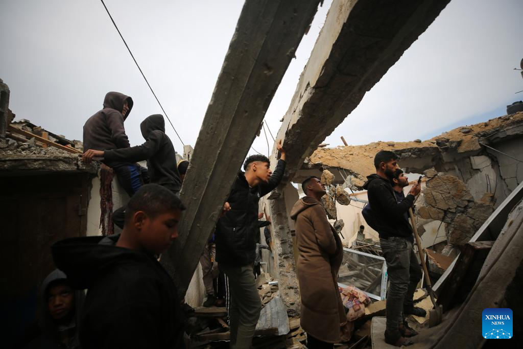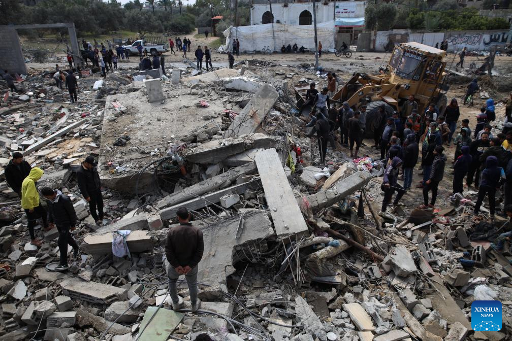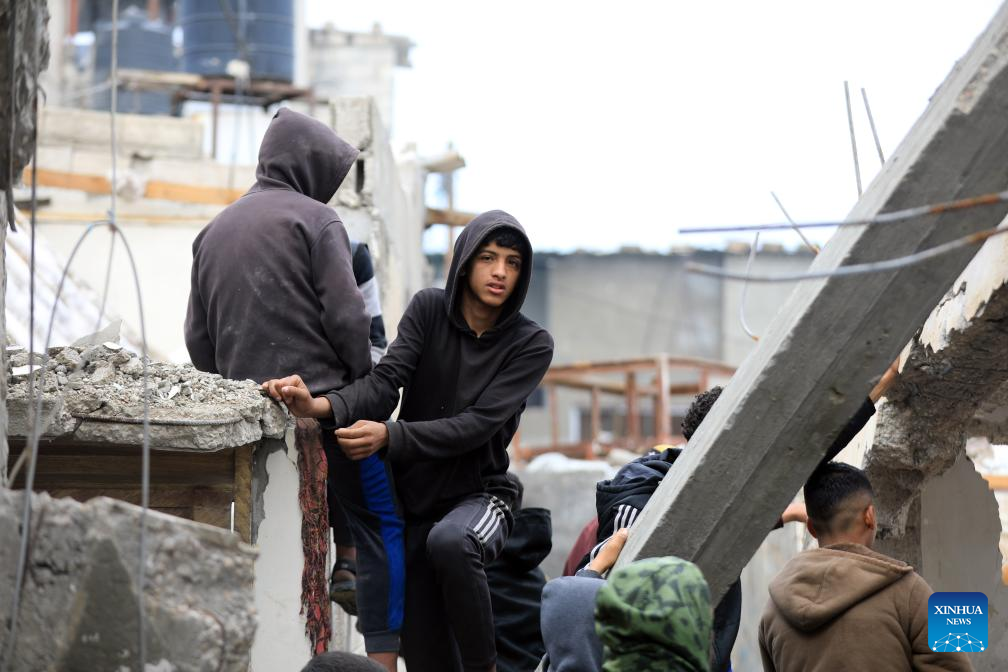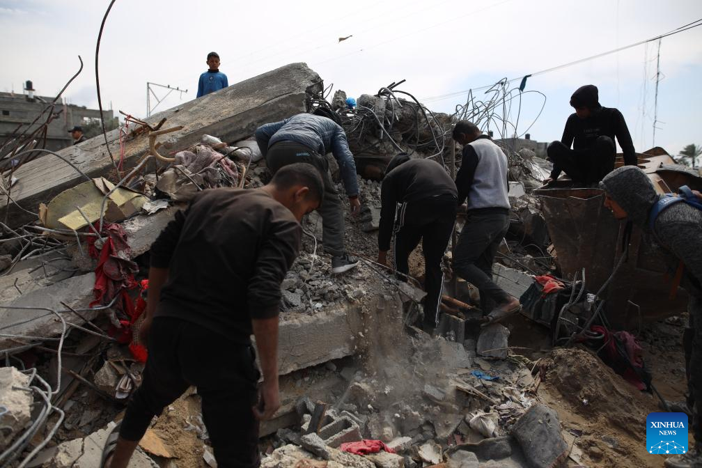 People search among the rubble of a destroyed building in the southern Gaza Strip city of Rafah, on March 19, 2024. (Photo by Yasser Qudih/Xinhua)