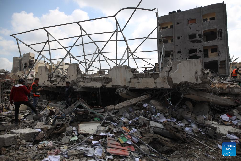 People search among the rubble after an Israeli airstrike in the Nuseirat refugee camp, central Gaza Strip, on March 19, 2024. (Xinhua)