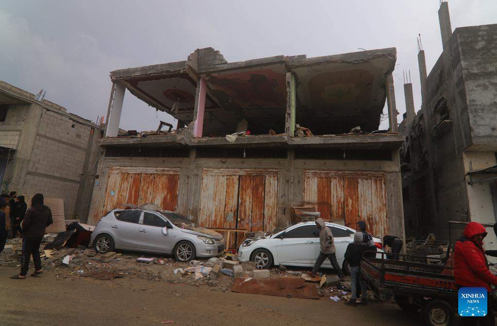 People walk past a destroyed building after an Israeli airstrike in the southern Gaza Strip city of Rafah, March 19, 2024.?(Photo by Khaled Omar/Xinhua)