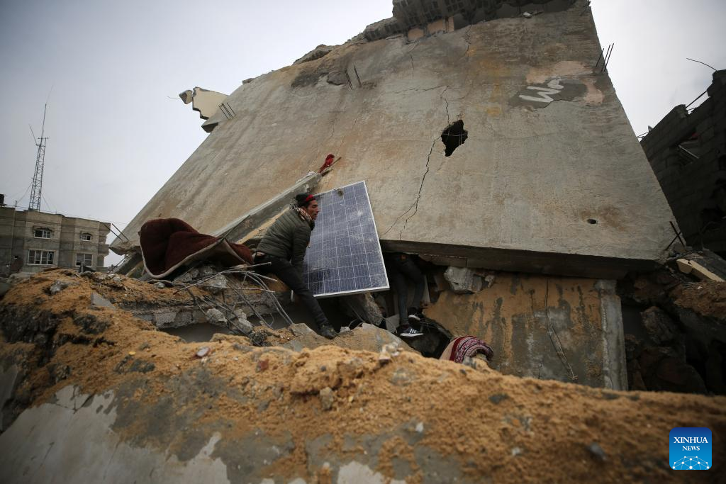 People collect items from the rubble after an Israeli airstrike in the Nuseirat refugee camp, central Gaza Strip, on March 19, 2024. (Xinhua)
