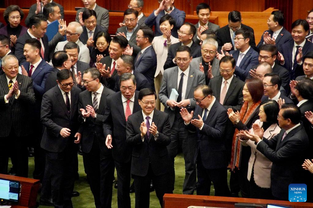 The Legislative Council (LegCo) of the Hong Kong Special Administrative Region (HKSAR) passes the safeguarding national security bill in a unanimous vote during the third reading in Hong Kong, south China, March 19, 2024. The ordinance fully implements constitutional responsibilities stipulated under Article 23 of the HKSAR Basic Law, and is considered crucial for fixing loopholes and weak links in the HKSAR's system on protecting national security. (Xinhua/Lui Siu Wai)