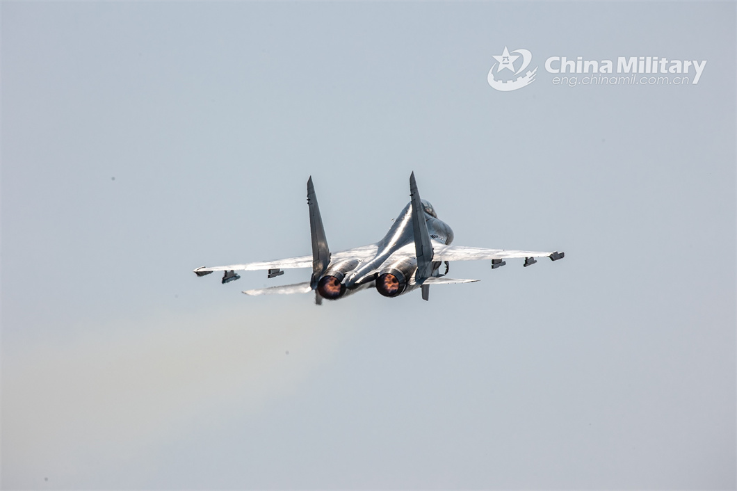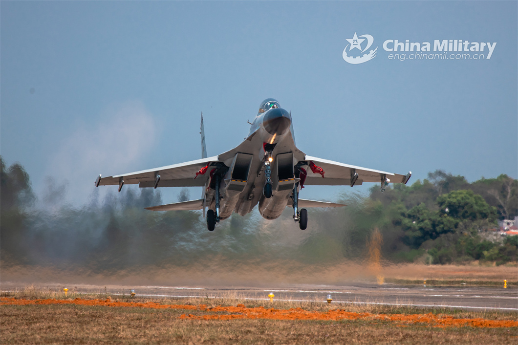 A fighter jet attached to a naval aviation unit under the PLA Southern Theater Command takes off during a flight training exercise on March 1, 2024. (eng.chinamil.com.cn/Photo by Fu Jinquan)