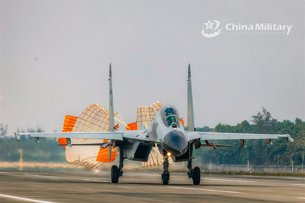A fighter jet attached to a naval aviation unit under the PLA Southern Theater Command pops a drag parachute to slow down on the runway during a flight training exercise on March 1, 2024. (eng.chinamil.com.cn/Photo by Fu Jinquan)