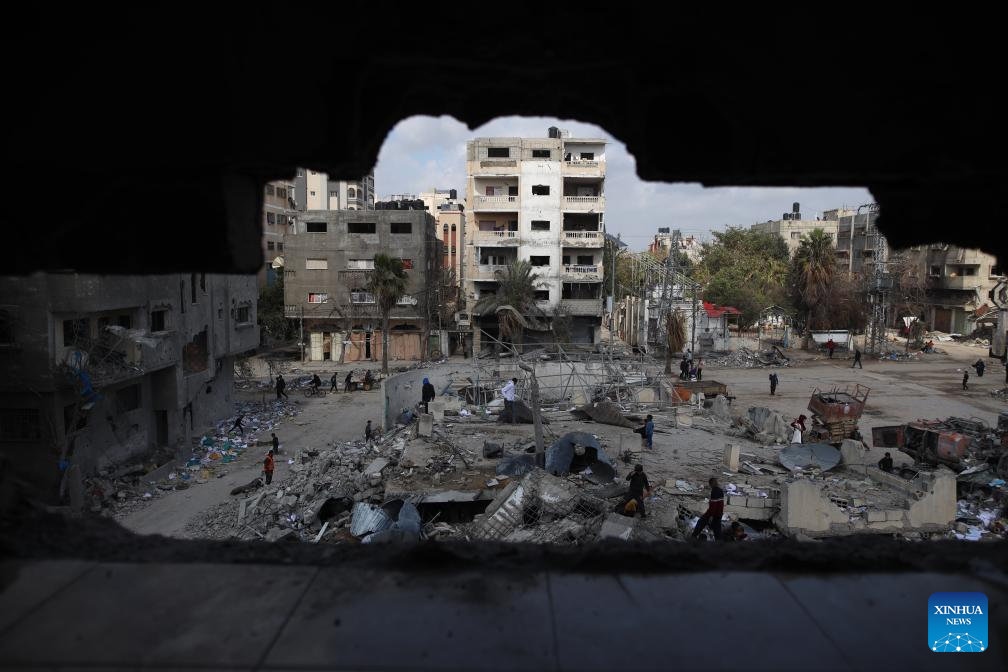 People are framed by the structure of a damaged building at Bureij refugee camp in the central Gaza Strip, on March 19, 2024. The Palestinian death toll from the ongoing Israeli attacks on the Gaza Strip has risen to 31,819, with 73,934 others wounded, the Hamas-run Health Ministry said on Tuesday. (Xinhua)