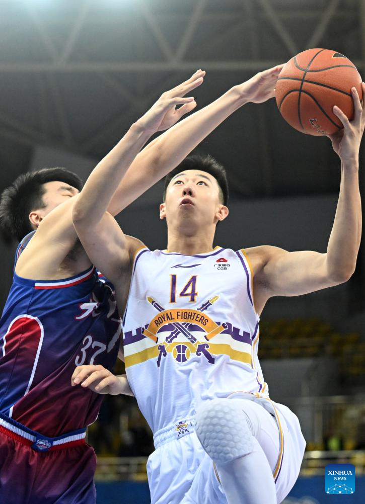 Wang Shaojie (R) of Beijing Royal Fighters goes for a lay up during the 45th round match between Tianjin Pioneers and Beijing Royal Fighters at the 2023-2024 season of the Chinese Basketball Association (CBA) league in north China's Tianjin, March 19, 2024. (Xinhua/Zhao Zishuo)