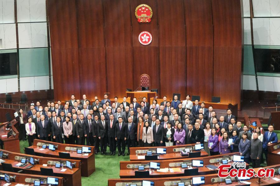 HKSAR Chief Executive John Lee and legislators pose for a group photo after LegCo passed the safeguarding national security bill in Hong Kong, March 19, 2024. (Photo: China News Service/Chen Yongnuo)