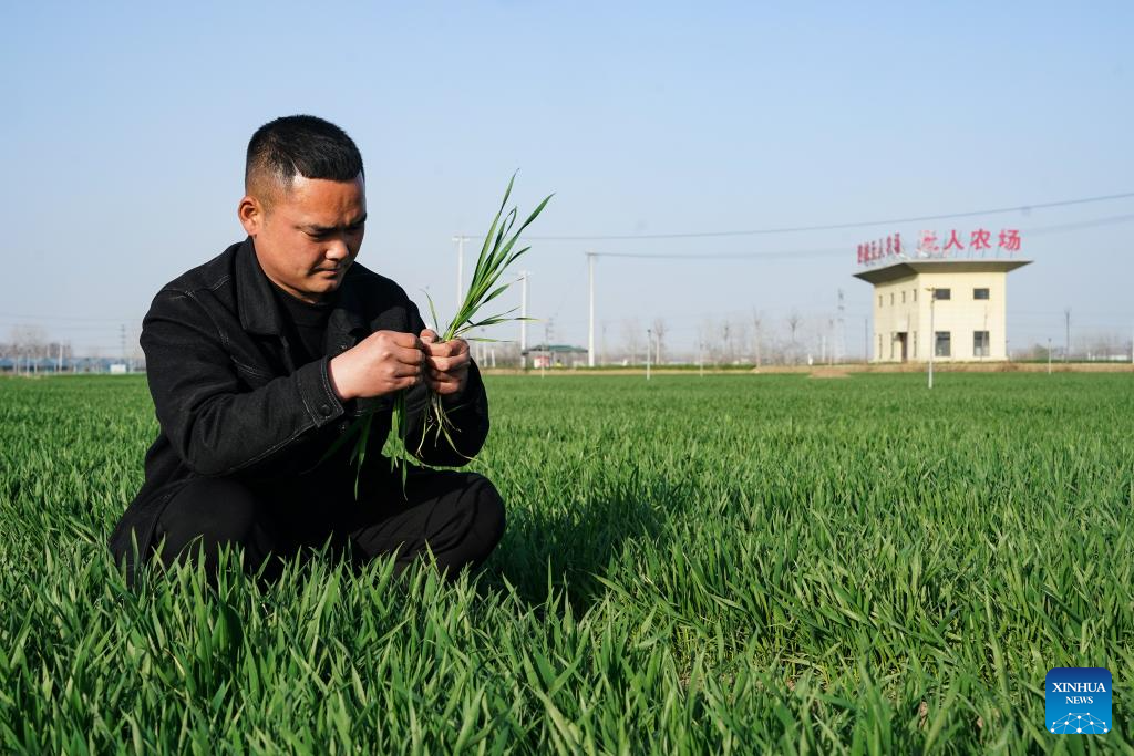 Jiao Rui checks the growth of the crops at his smart farm at Shuanglou Village, Bozhou City of east China's Anhui Province, March 19, 2024. By introducing IT technologies like Internet of Things, Big Data and Artificial Intelligence, Jiao Rui, a young farmer born in the 1990s, has set up a smart decision making system on his farm which greatly improved the production efficiency. (Xinhua/Du Yu)