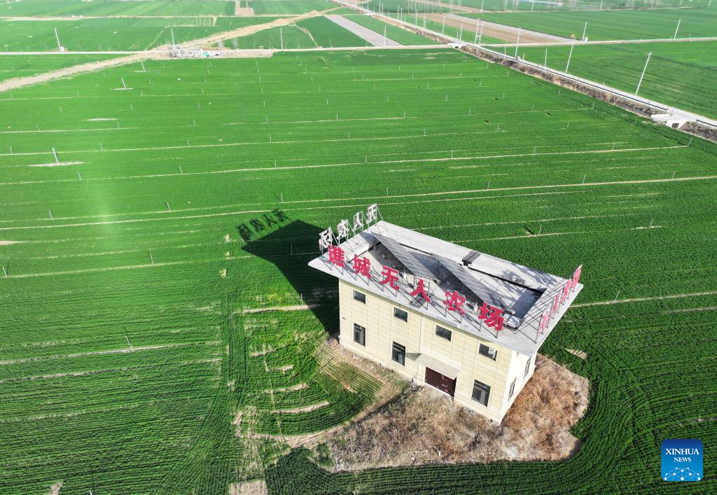 An aerial drone photo taken on March 19, 2024 shows the smart farm at Shuanglou Village, Bozhou City of east China's Anhui Province. By introducing IT technologies like Internet of Things, Big Data and Artificial Intelligence, Jiao Rui, a young farmer born in the 1990s, has set up a smart decision making system on his farm which greatly improved the production efficiency. (Xinhua/Du Yu)