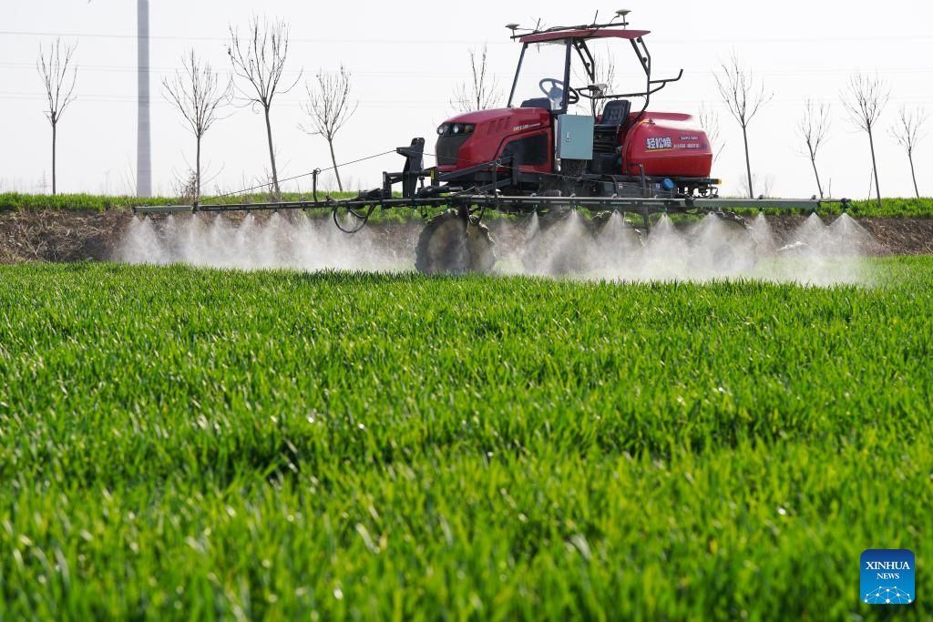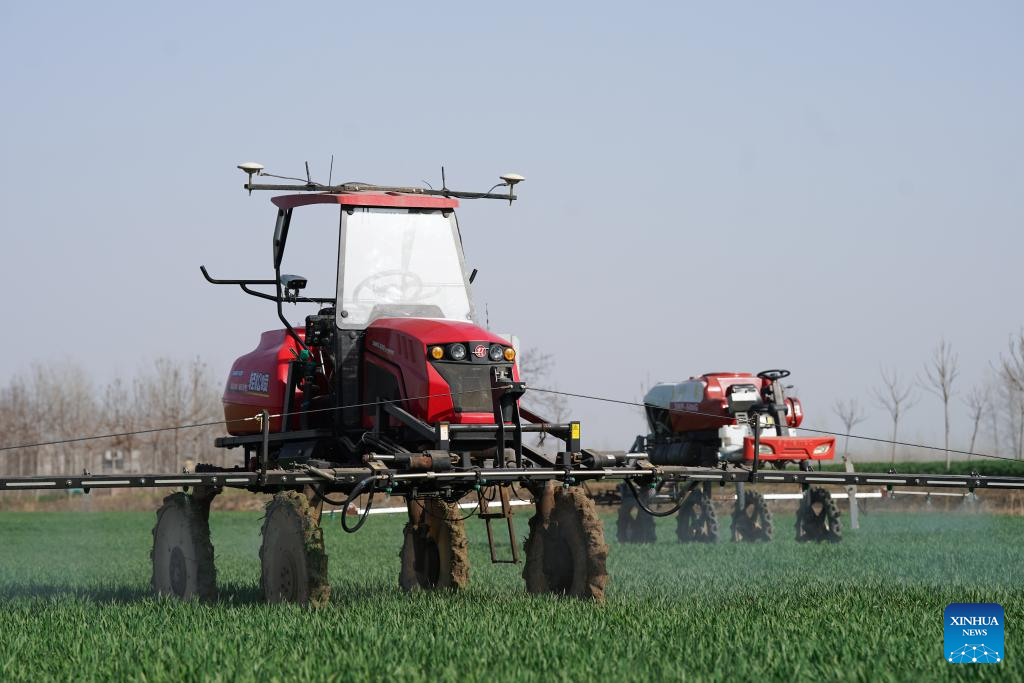 A self-driving machine sprays herbicides in a field at the smart farm at Shuanglou Village, Bozhou City of east China's Anhui Province, March 19, 2024. By introducing IT technologies like Internet of Things, Big Data and Artificial Intelligence, Jiao Rui, a young farmer born in the 1990s, has set up a smart decision making system on his farm which greatly improved the production efficiency. (Xinhua/Du Yu)