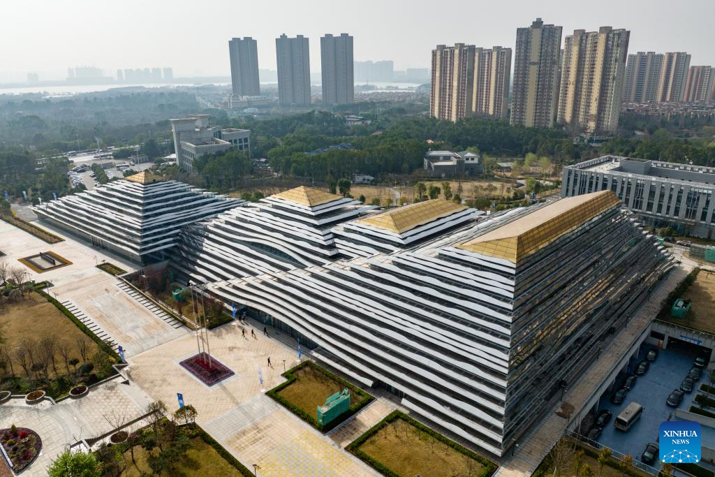 An aerial drone photo taken on March 19, 2024 shows the permanent venue of the 7th China-France Forum on Urban Sustainable Development in the Sino-French Wuhan Ecological Demonstration City, in Wuhan, central China's Hubei Province. This year marks the 10th anniversary since China and France signed the agreement to build the Sino-French Wuhan Ecological Demonstration City. The eco city, covering an area of 39 square kilometers, has integrated Chinese and French ecological urban construction concepts and is rising as a popular region for residents and companies. (Xinhua/Wu Zhizun)