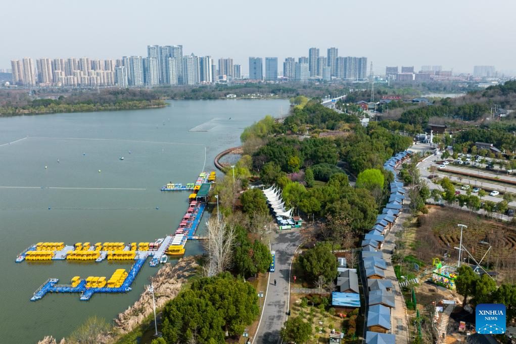 An aerial drone photo taken on March 19, 2024 shows the Houguan Lake national wetland park in the Sino-French Wuhan Ecological Demonstration City in Wuhan, central China's Hubei Province. This year marks the 10th anniversary since China and France signed the agreement to build the Sino-French Wuhan Ecological Demonstration City. The eco city, covering an area of 39 square kilometers, has integrated Chinese and French ecological urban construction concepts and is rising as a popular region for residents and companies. (Xinhua/Wu Zhizun)