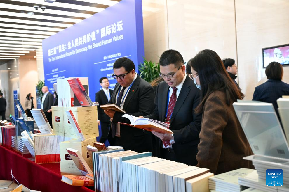 Guests read displayed books before the third "International Forum on Democracy: The Shared Human Values" in Beijing, capital of China, March 20, 2024. The forum was held Wednesday in Beijing. (Xinhua/Jin Liangkuai)