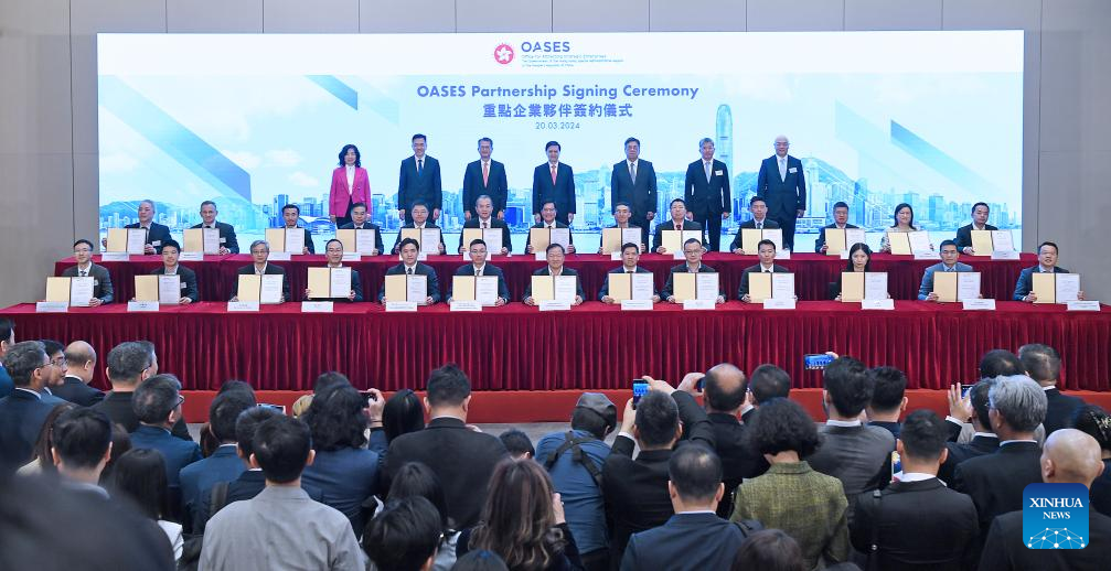 This photo taken on March 20, 2024 shows a signing ceremony held by the Office for Attracting Strategic Enterprises (OASES) of the Hong Kong Special Administrative Region (HKSAR) government in south China's Hong Kong.?(Xinhua/Chen Duo)