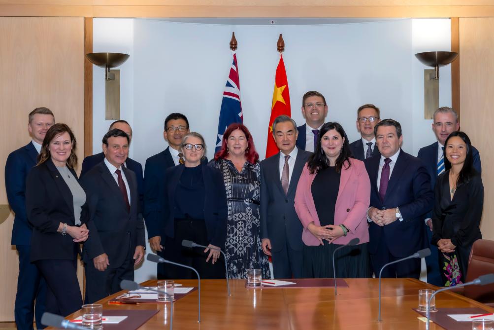 Chinese Foreign Minister Wang Yi, also a member of the Political Bureau of the Communist Party of China Central Committee, meets with members of the Australia-China Parliamentary Group in Canberra, Australia, March 20, 2024. (Photo by Chu Chen/Xinhua)