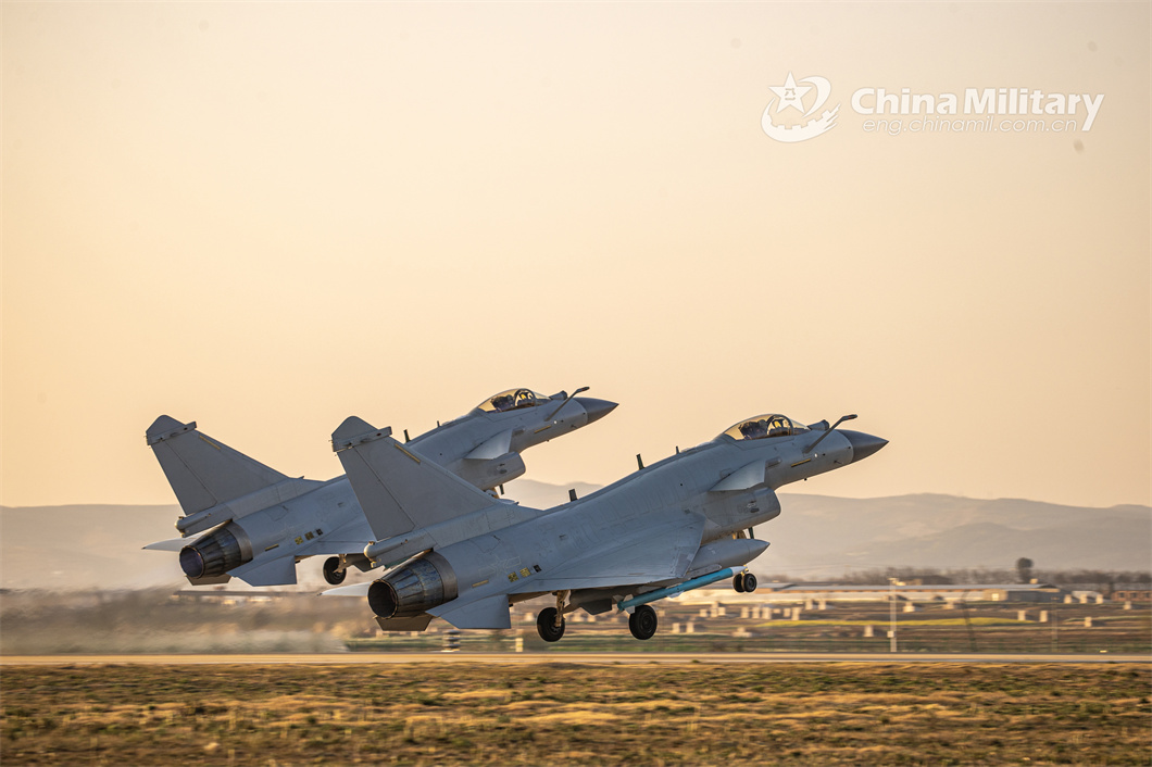 Two J-10 fighter jets attached to an aviation brigade with the air force under the PLA Southern Theater Command take off in formation during a flight training exercise in early March, 2024. (eng.chinamil.com.cn/Photo by Wang Guoyun)