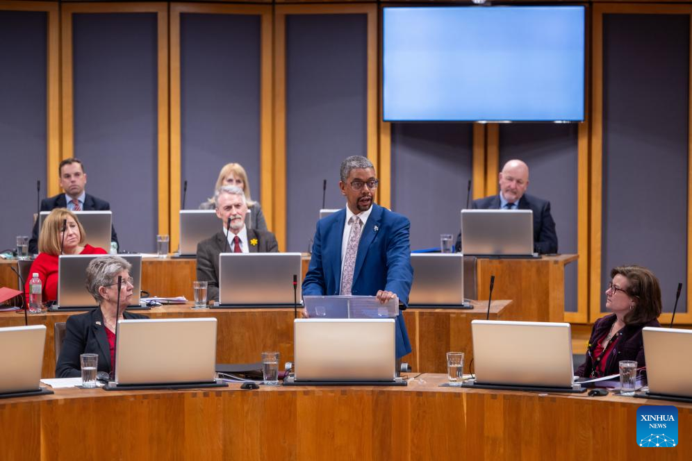 Photo taken on March 20, 2024 shows Vaughan Gething (C, Front) in the Senedd, the Welsh parliament, in Cardiff, Wales, Britain. Vaughan Gething was confirmed as Wales' new first minister by the Welsh parliament on Wednesday. (Welsh Parliament/Handout via Xinhua)