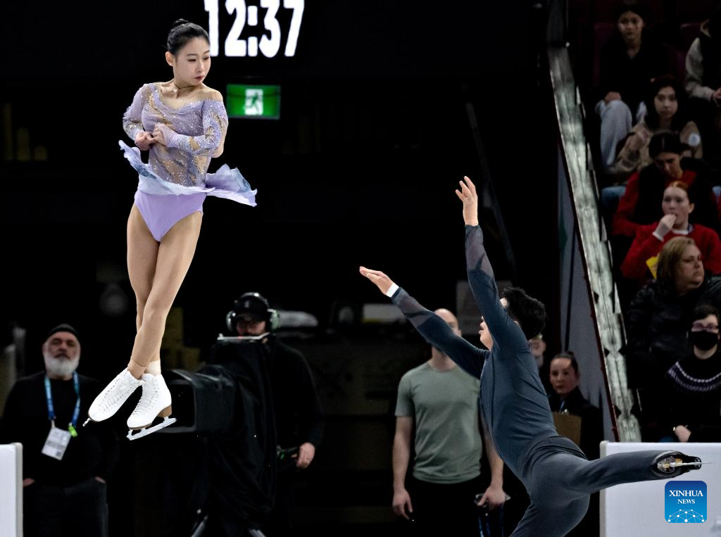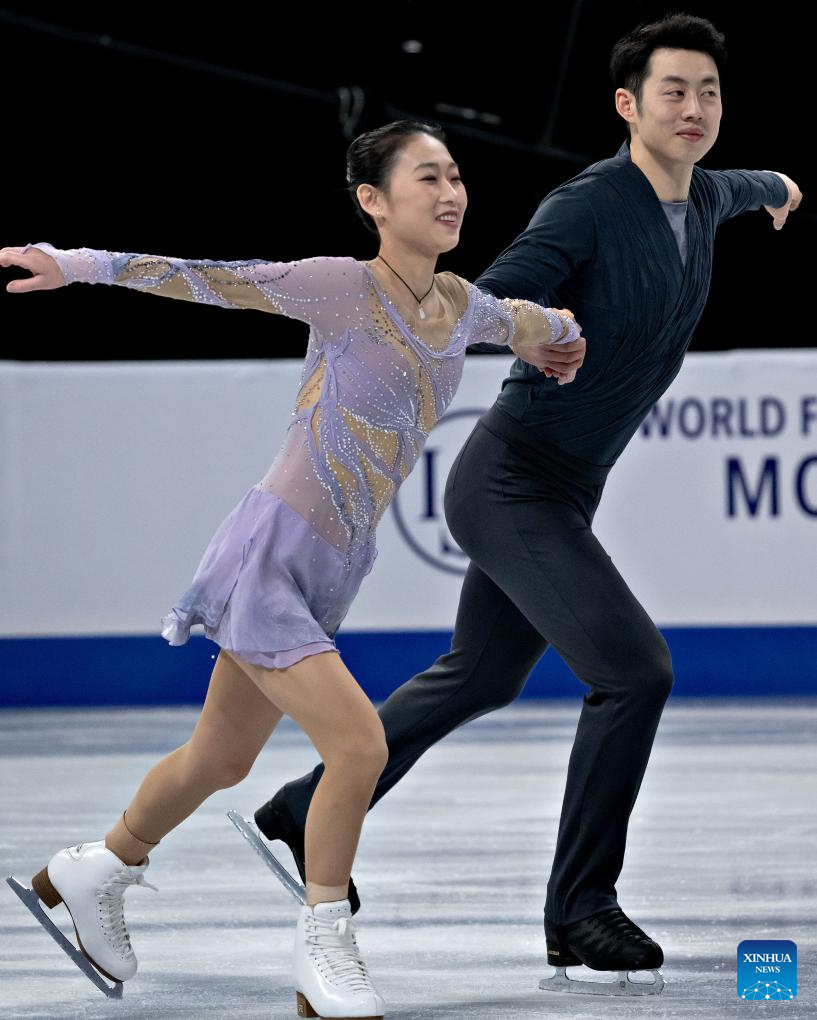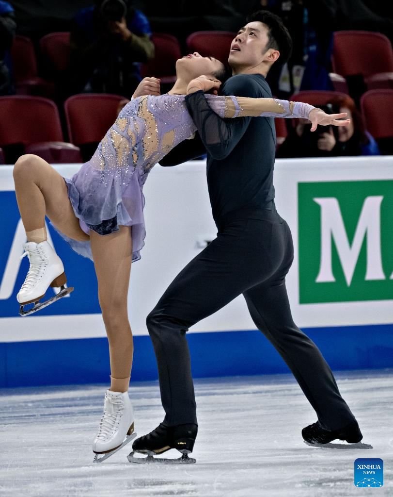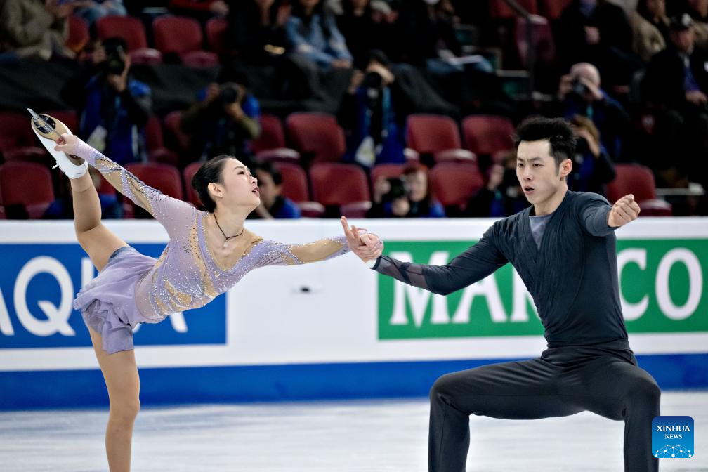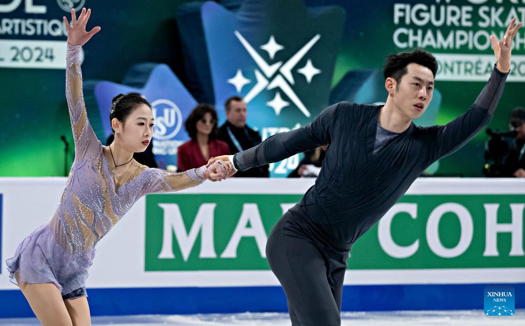 Peng Cheng (L)/Wang Lei of China compete in pairs short program of the International Skating Union (ISU) World Figure Skating Championships at the Bell Centre in Montreal, Canada, on March 20, 2024. (Photo by Andrew Soong/Xinhua)
