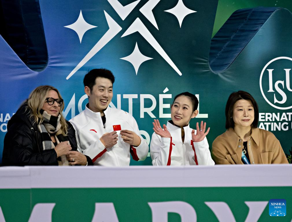 Peng Cheng (2nd R)/Wang Lei (2nd L) of China wait for their results after competing in pairs short program of the International Skating Union (ISU) World Figure Skating Championships at the Bell Centre in Montreal, Canada, on March 20, 2024. (Photo by Andrew Soong/Xinhua)