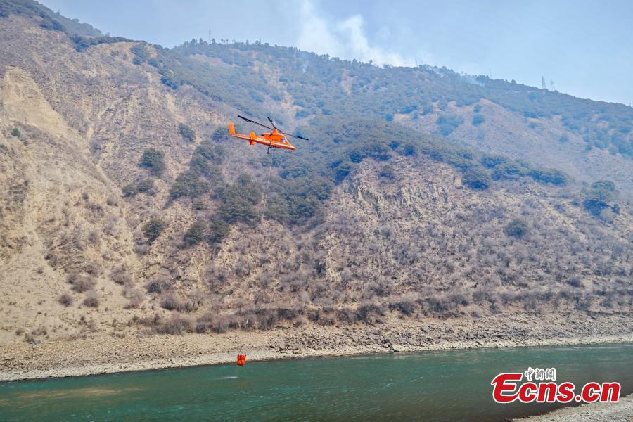 A firefighting helicopter fetches water to battle a forest fire in Yajiang County, southwest China's Sichuan Province, March 20, 2024. (Photo: China News Service/Liu Zhongjun)