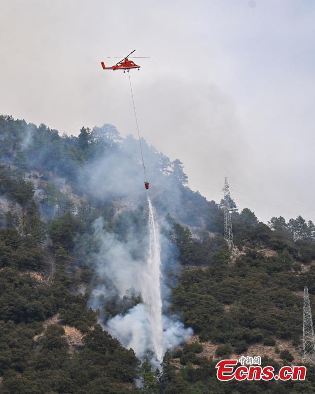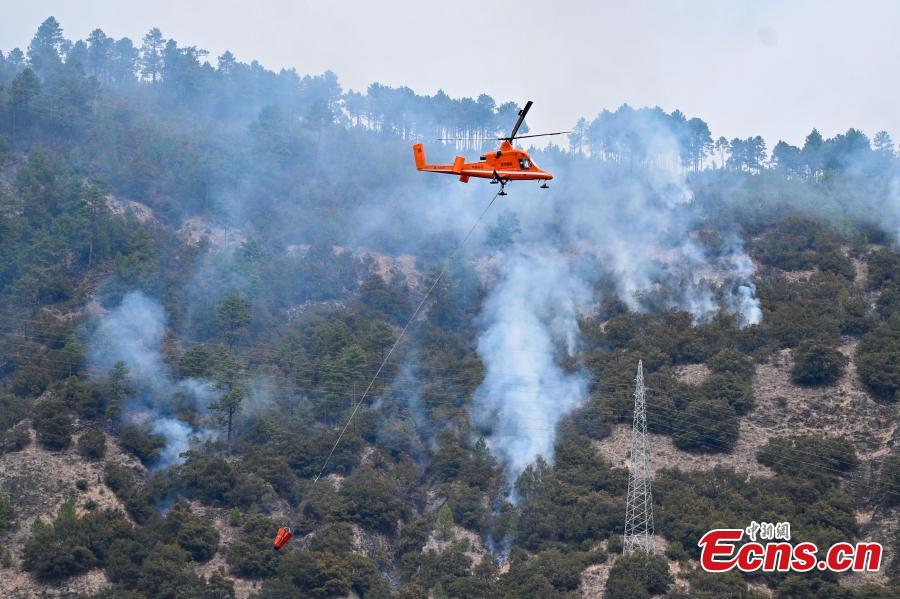 A firefighting helicopter extinguishes a forest fire in Yajiang County, southwest China's Sichuan Province, March 20, 2024. (Photo: China News Service/Liu Zhongjun)