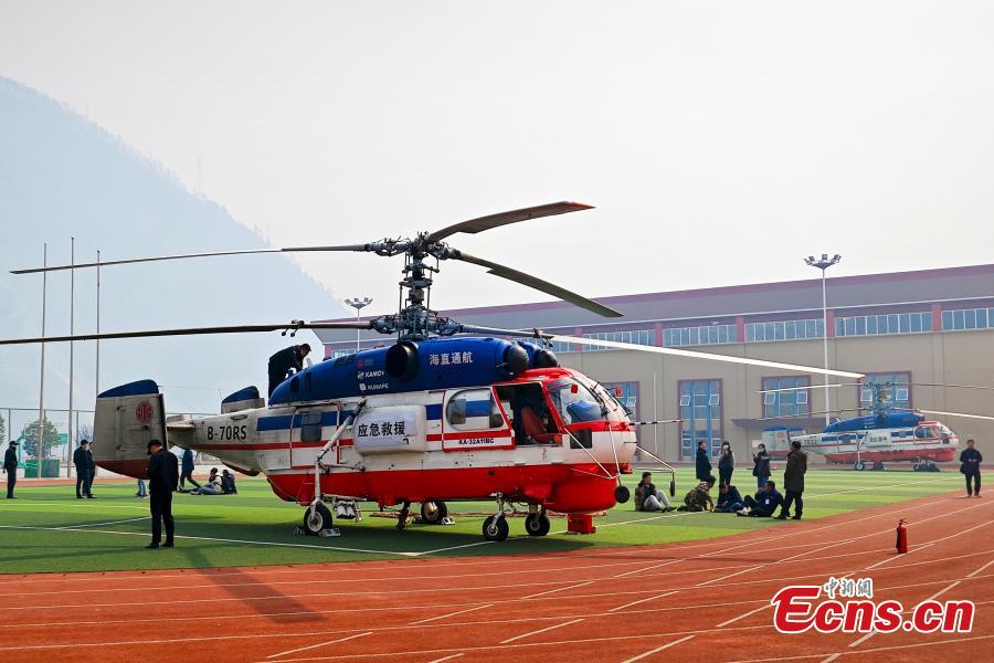 Two K-32 helicopters prepare to take off from a playground in Yajiang County, southwest China's Sichuan Province, March 20, 2024. (Photo: China News Service/Liu Zhongjun)