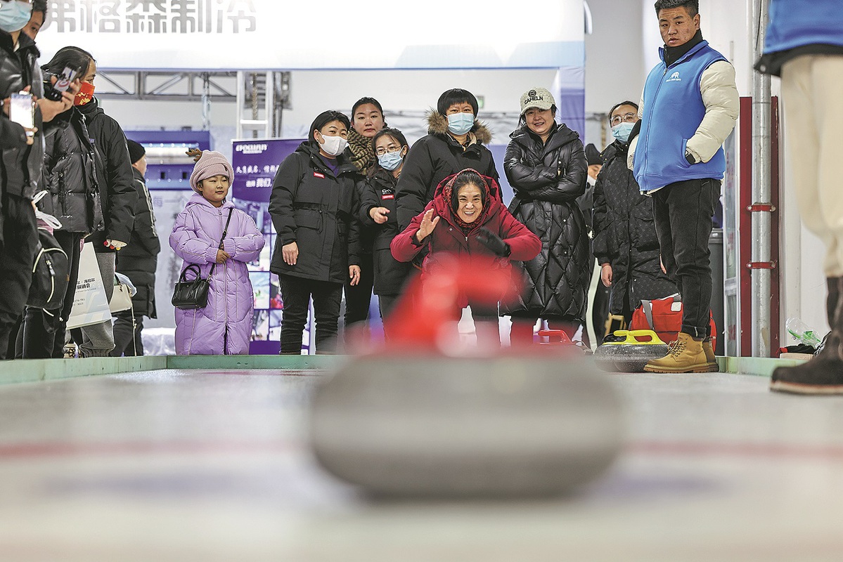 A woman tries curling on Dec 16 at the Ice and Snow Winter Fair in the Inner Mongolia autonomous region. WANG KAIYAN/XINHUA