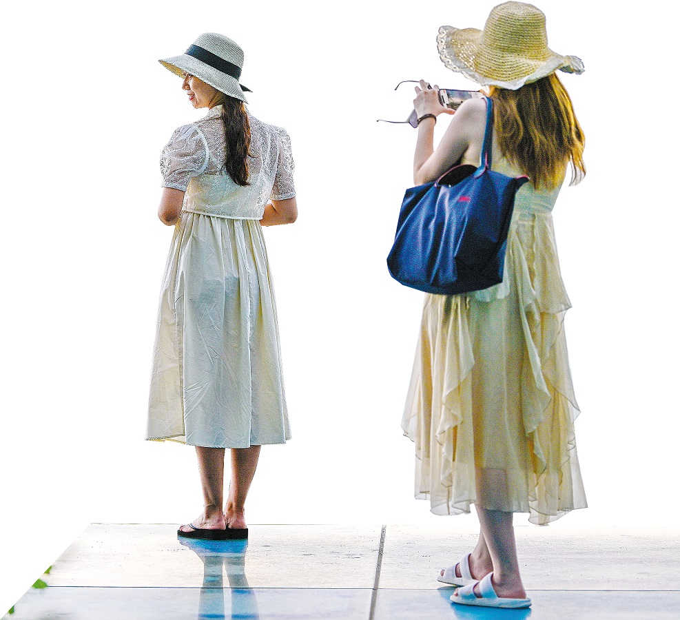 Two tourists take photos on Aug 29 in Sanya, Hainan province. PU XIAOXU/XINHUA